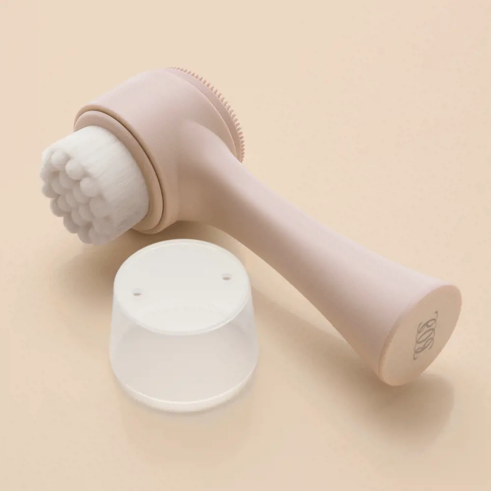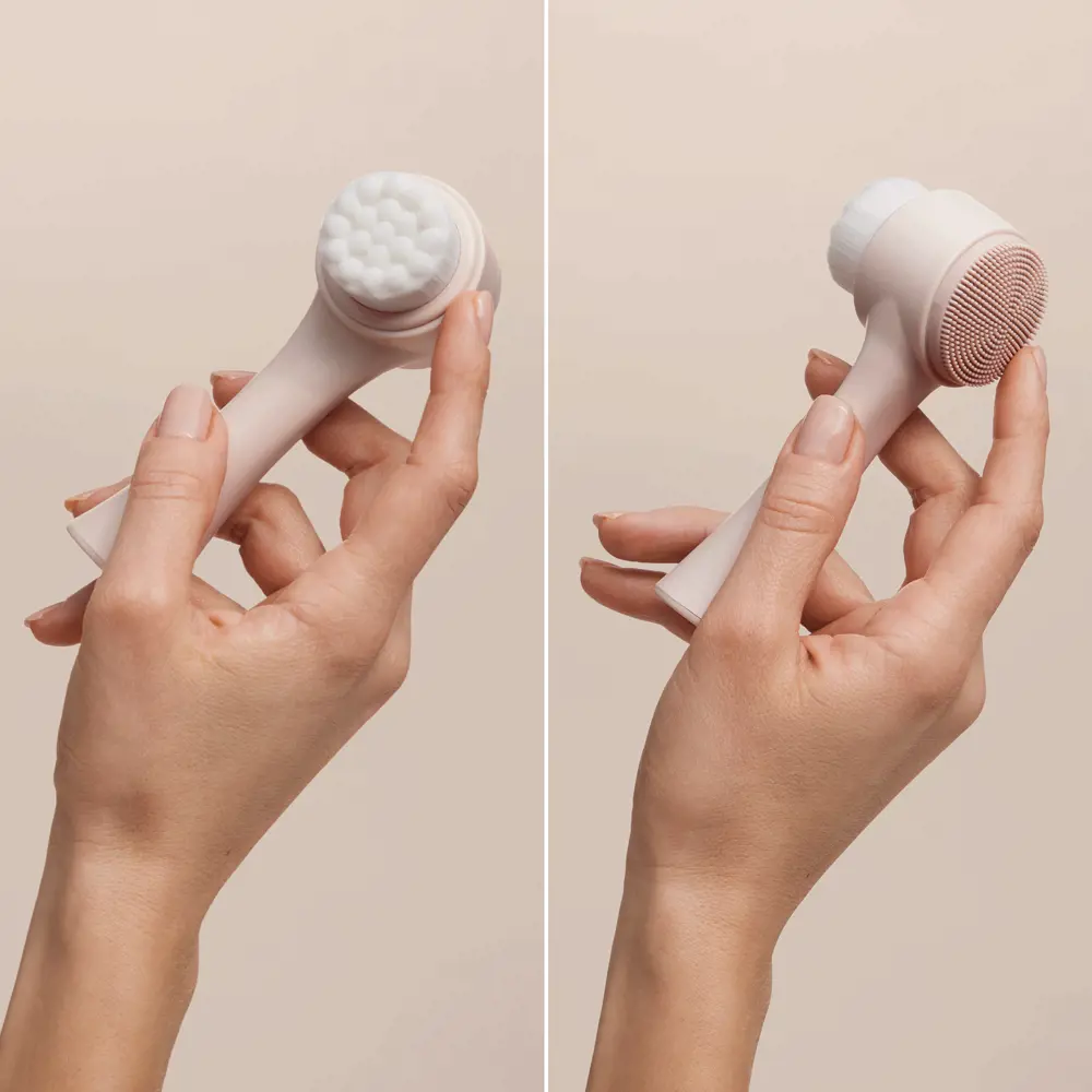 ۲. با طرف دارای موی نرم نایلونی، پوست را به صورت حرکت دایرهای ملایم ماساژ دهید تا آلودگیها پاک شوند.